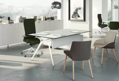 Enfin, le bureau avec retour structure l’espace en partageant la surface de votre bureau entre votre place et le reste de la pièce, vous apportant un sentiment d’intimité renforcé et une présence plus marquée lors de vos entretiens avec des interlocuteurs.