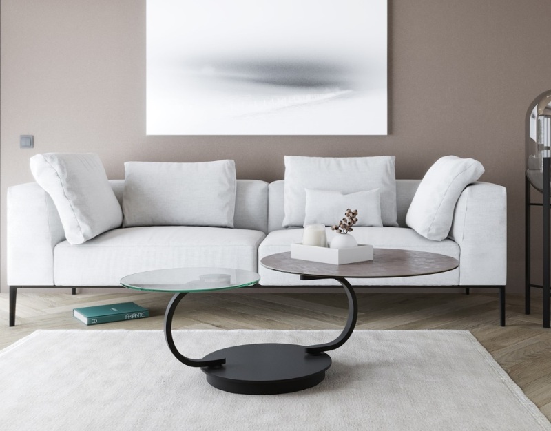 La table basse Eviona est un produit très exclusif. Il s’agit d’une table basse articulée avec un mécanisme de rotation synchronisée. La base est en acier laqué noir et elle est très lourde afin de lui garantir une excellente stabilité. Ses bras sont des demi- anneaux circulaires qui pivotent de manière synchrone quand vous déployez la table. Cette table basse existe en différentes finitions : le plateau supérieur est disponible en quatre céramiques différentes importées d’Espagne collée sur un verre de 6mm. Le plateau inférieur est toujours en verre trempé de 10mm. La table basse Eviona est présentée ici avec une céramique acier collée sur un vitrage de 6mm afin de donner une excellente résistance au plateau.
